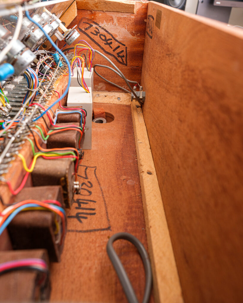 Internally, the instrument is assembled from Dewtron modules mounted behind the front panel and fully potted in resin. Tag‑strip wiring connects the modules to the keyboard contacts and rear panel jacks. Hand‑written markings such as “730414” appear inside the wooden case, but there is no formal model‑number plate beyond the Gipsy script on the front.